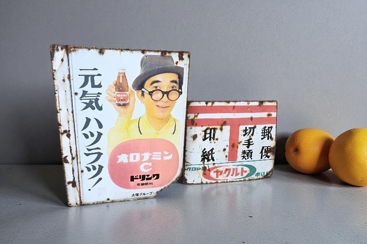 ○オロナミンC ホーロー看板&ヤクルト販売店が郵便業務看板2枚セット ヴィンテージ 古道具のgplus広島2511k