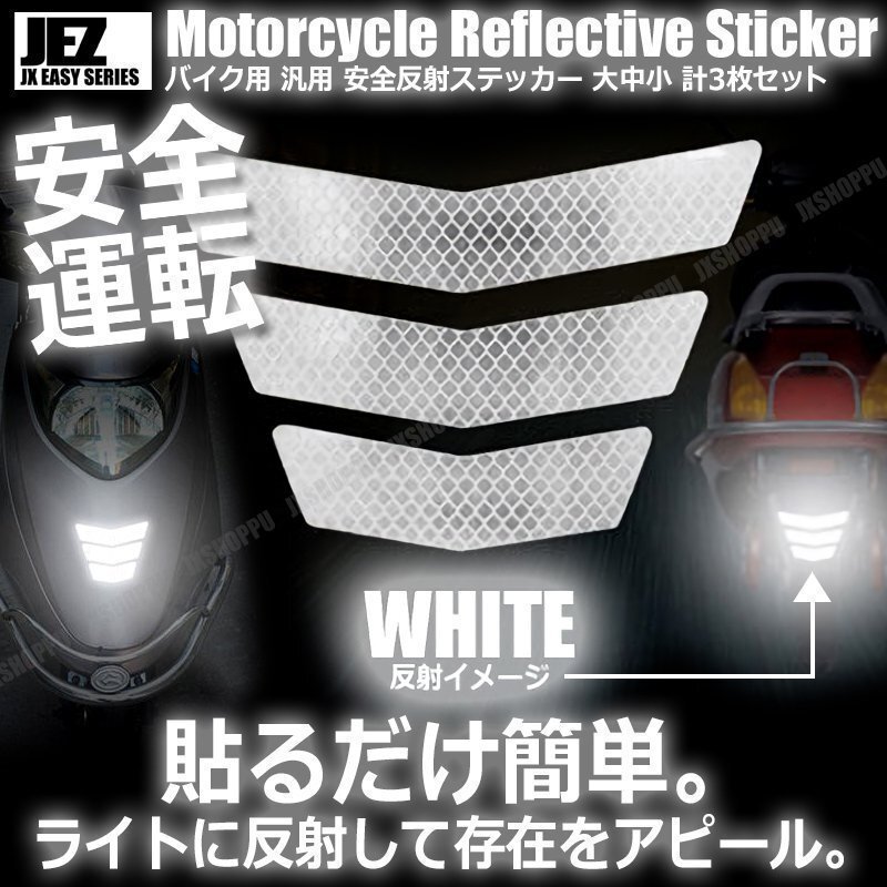 - 送料0円 バイク用 反射ステッカー [ホワイト] 大中小 各1枚 計3枚セット 安全 ツーリング 反射板 リフレクター シール 夜間 目立つ 後部