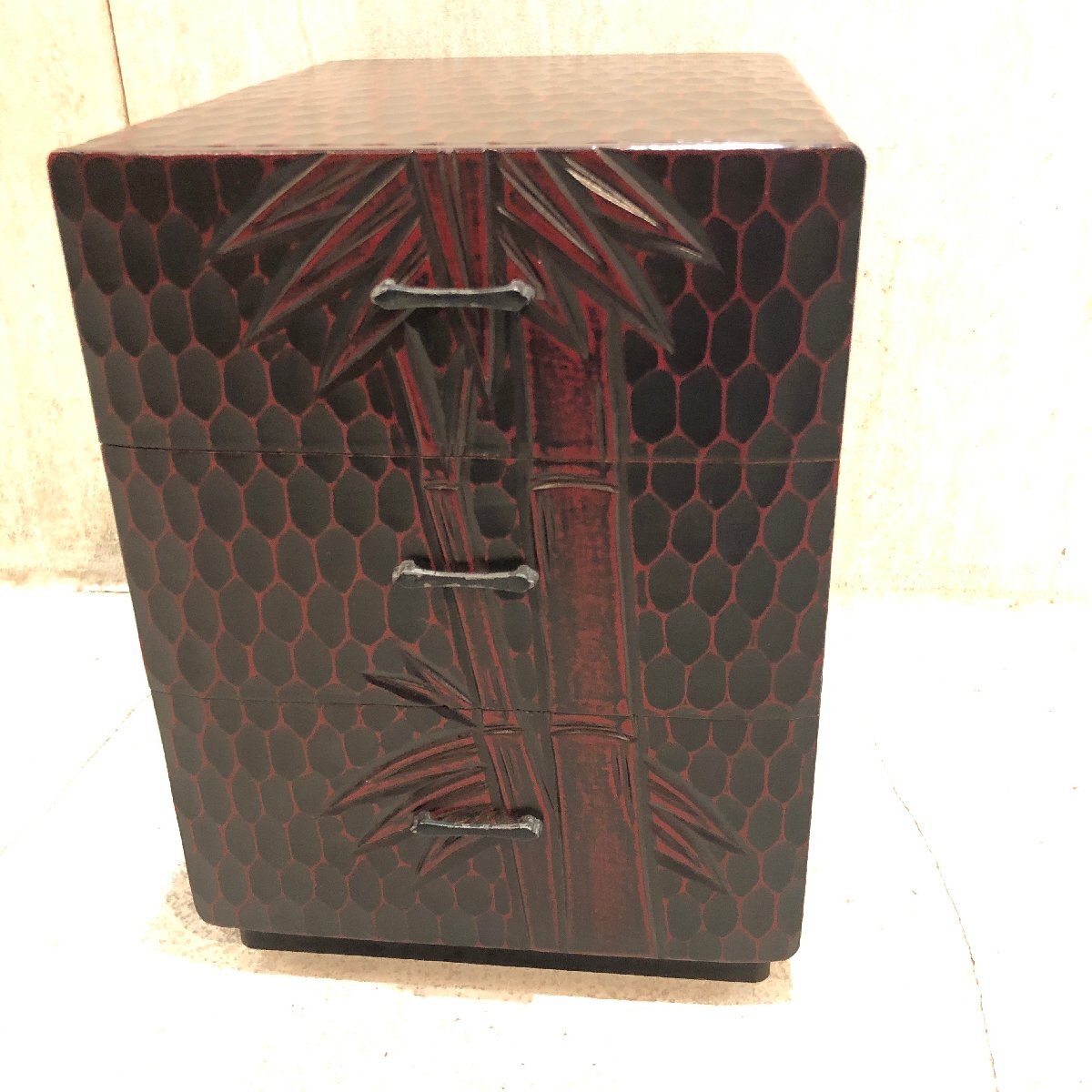 - ■■329■鎌倉彫り 卓上小物入れ 竹 小引き出し 3段 収納家具 木製家具 アンティーク 箪笥 小タンス 天然木