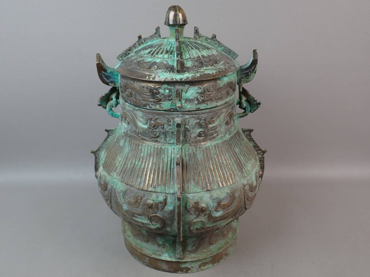 - 【骨董・茶道具】★中国古玩 青銅製 青銅器★★饕餮文手付蓋付壷 盛酒器 gq011zb 花道 華道 出土品 発掘品