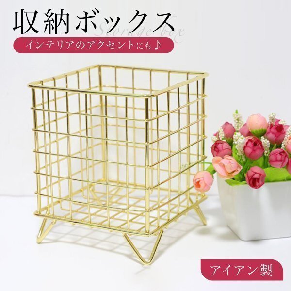 - バスケット カゴ 収納ボックス 小物入れ 小物収納 収納かご ゴールド 金 アイアン 見せる収納 卓上 ペン立て 化粧品 おしゃれ シンプル