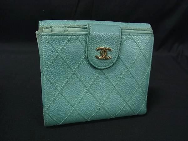 - 1円 CHANEL シャネル ココマーク マトラッセ ビコローレ キャビアスキン 二つ折り 財布 ウォレット レディース グリーン系 FT2061