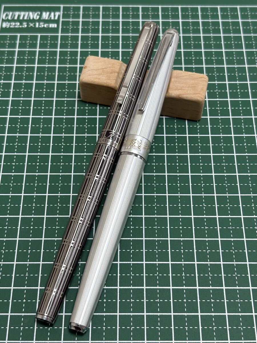 - プラチナ万年筆 18K WG 細字 2点 Riviere リビエール ロングストライプ PLATINUM 万年筆 蝕刻 格子柄