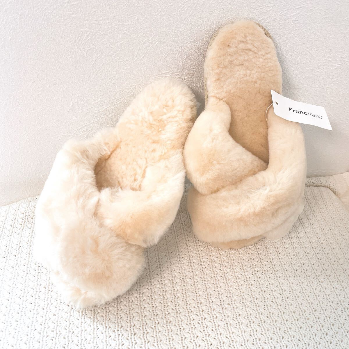- 新品フランフランFrancfrancシープファー羊毛クロスルームシューズ ムートン スリッパ靴シープスキン ファーサンダル白ホワイトM~Lサイズ
