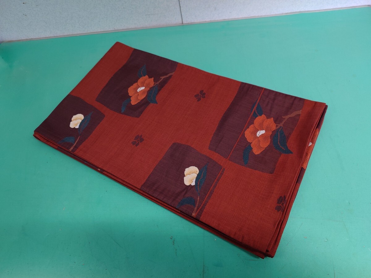 - ● 240 西陣 楽山 織物 袋織 くすみカラー 赤 椿柄 白椿 赤椿 赤市松 素敵な 帯 存在感抜群 中古 ③