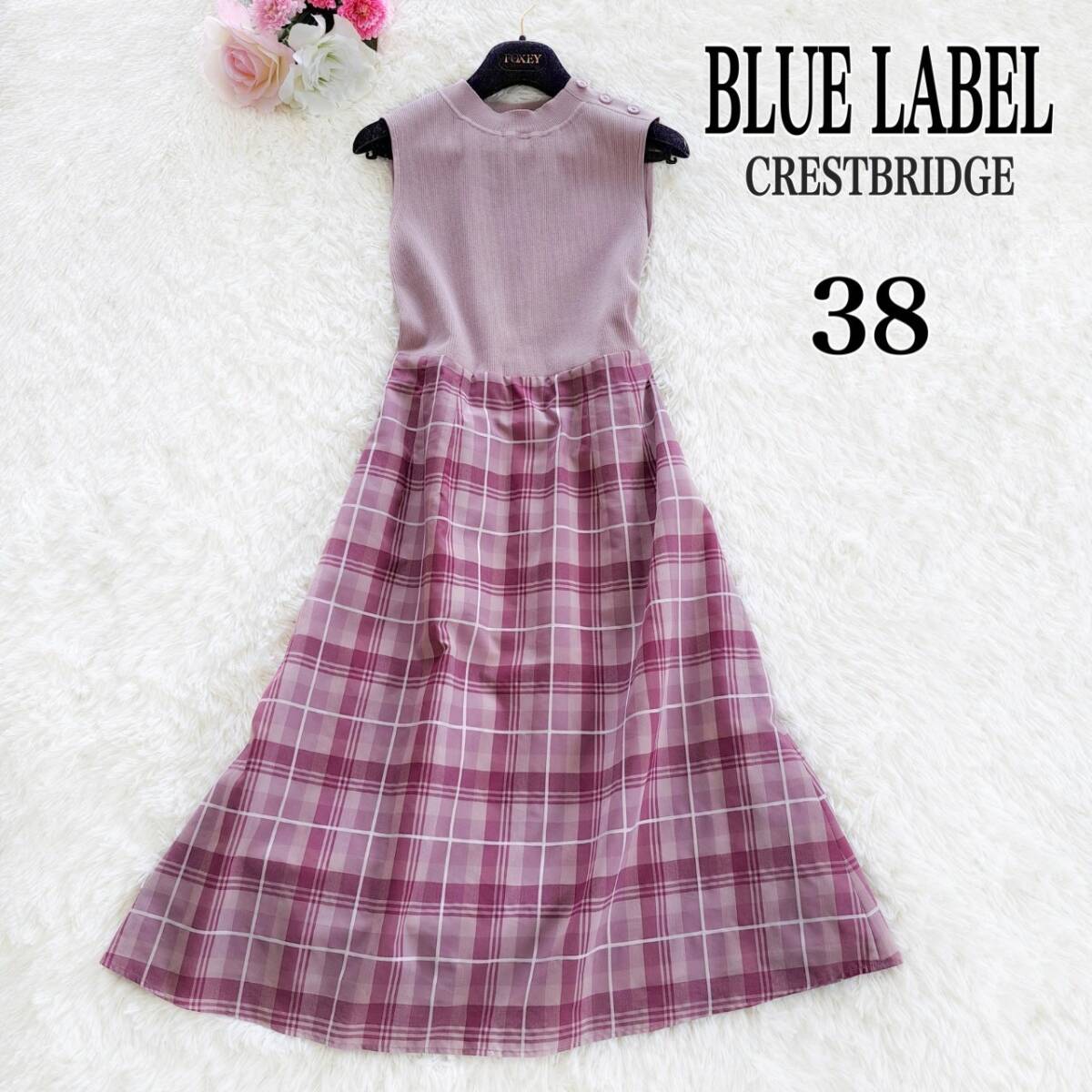 > ブルーレーベル クレストブリッジ シアー タータン チェック ニット コンビ ドレス ワンピース 未使用 タグ付き ピンク 38 ノースリーブ