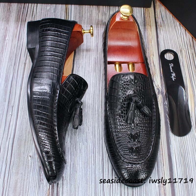 - 定価10万超★最高級 メンズシューズ 鰐柄 職人手作り ビジネスシューズ 本革レザーシューズ タッセルローファー 牛革 革靴 ブラック 25.5cm