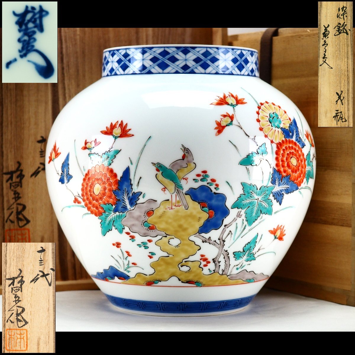 - 【治】十三代『酒井田柿右衛門』作 染錦菊鳥文花瓶☆共箱 幅 22cm 花器 花瓶 壷 花入 壺 (検索:今泉今右衛門 染錦) 本物保証 OJ06