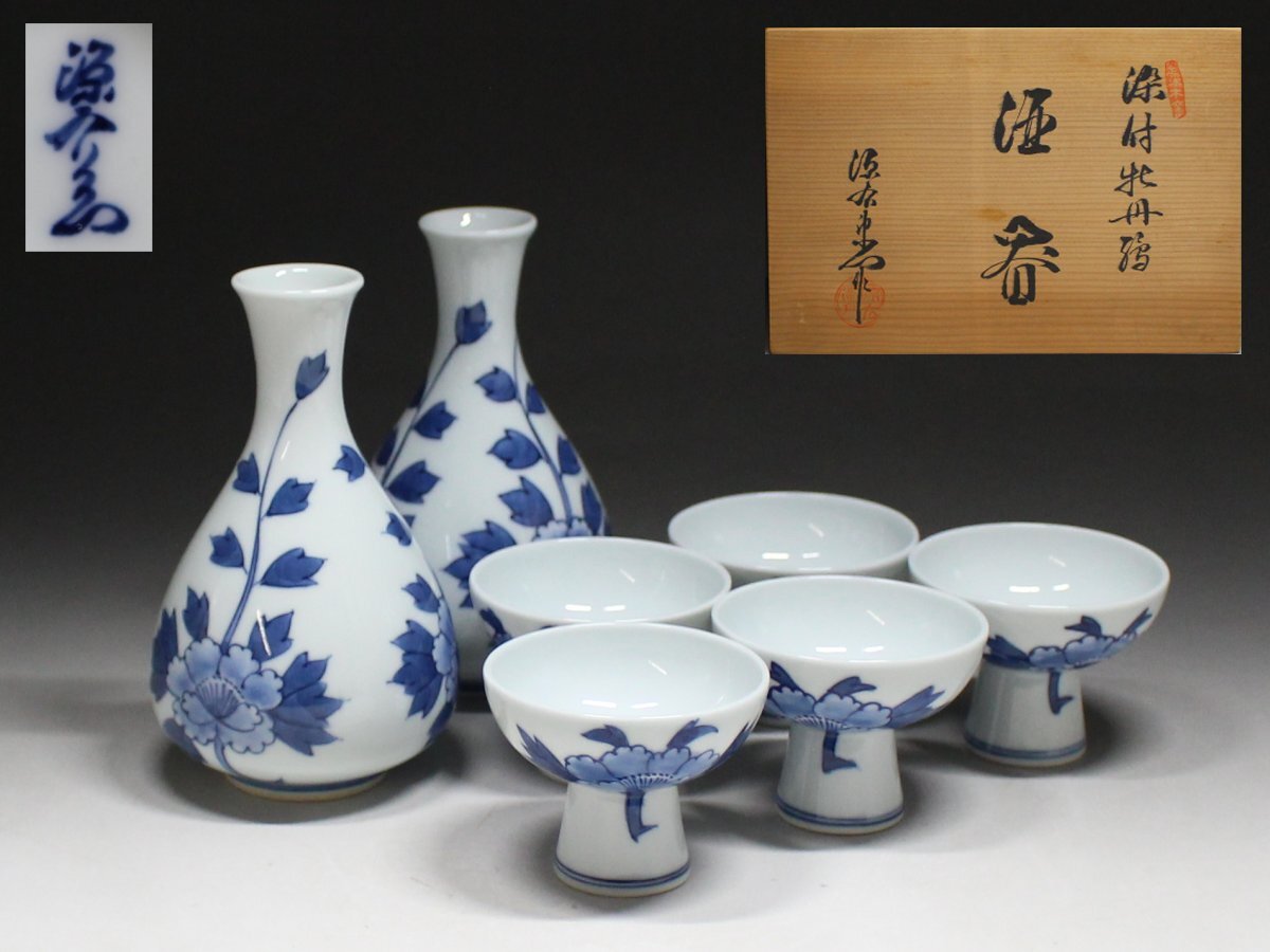 - ◆源右衛門窯・染付牡丹絵・ 酒器・酒器揃・徳利 2客・杯 5客・有田焼・共箱◆3310M