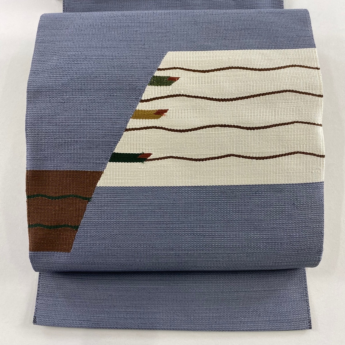 - 【美品】 名古屋帯 秀品 松葉仕立て トンネル仕立て 幾何学模様 青灰色 正絹 【中古】