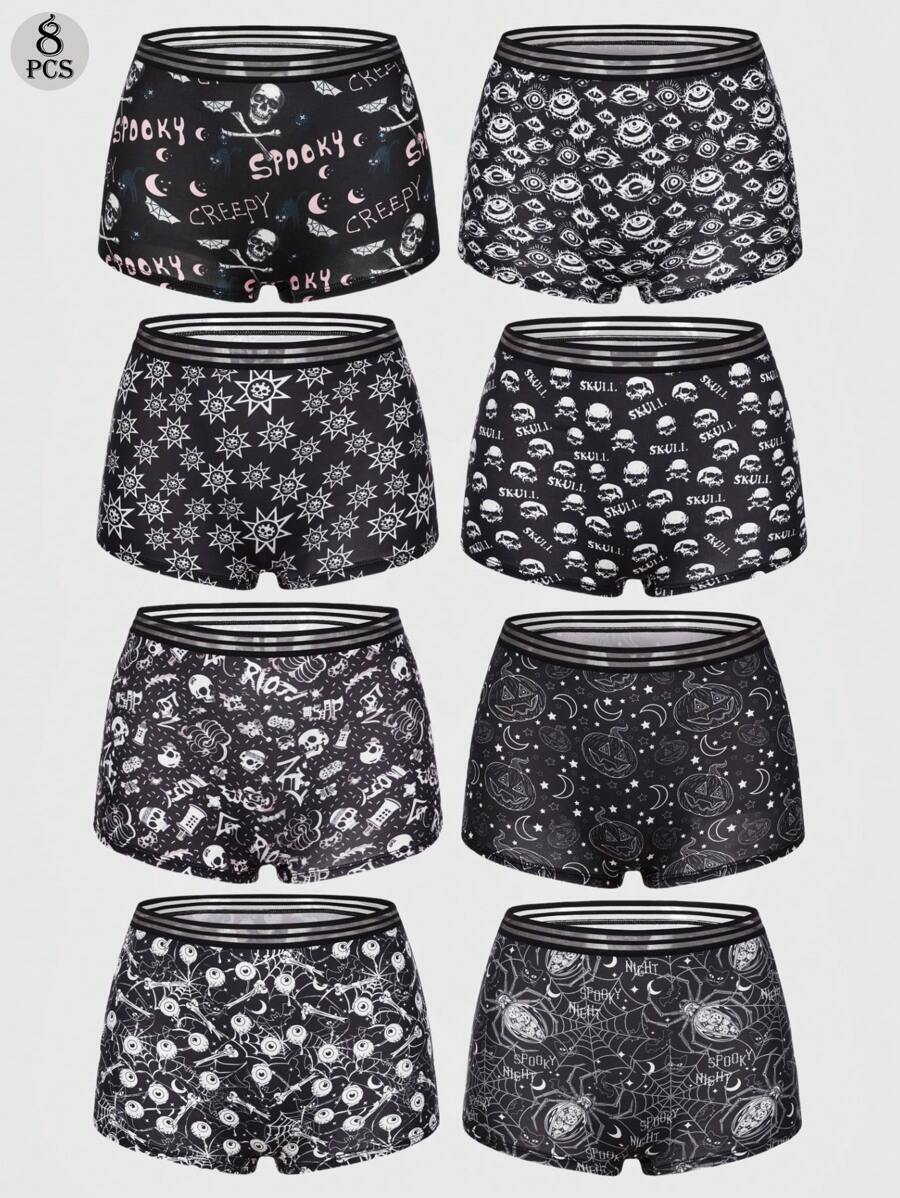 - インティメート ショーツ 8枚入り ウィメンズ ゴシック ハロウィン 髑髏プリント コントラスト バインディング ボーイショーツ、