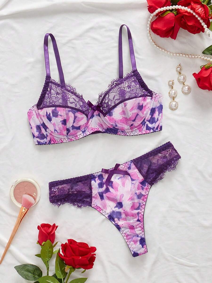 - インティメート ブラジャー ショーツ セット レース パッチワーク プリント メッシュ ワイヤレス ランジェリー ブラセット 2個