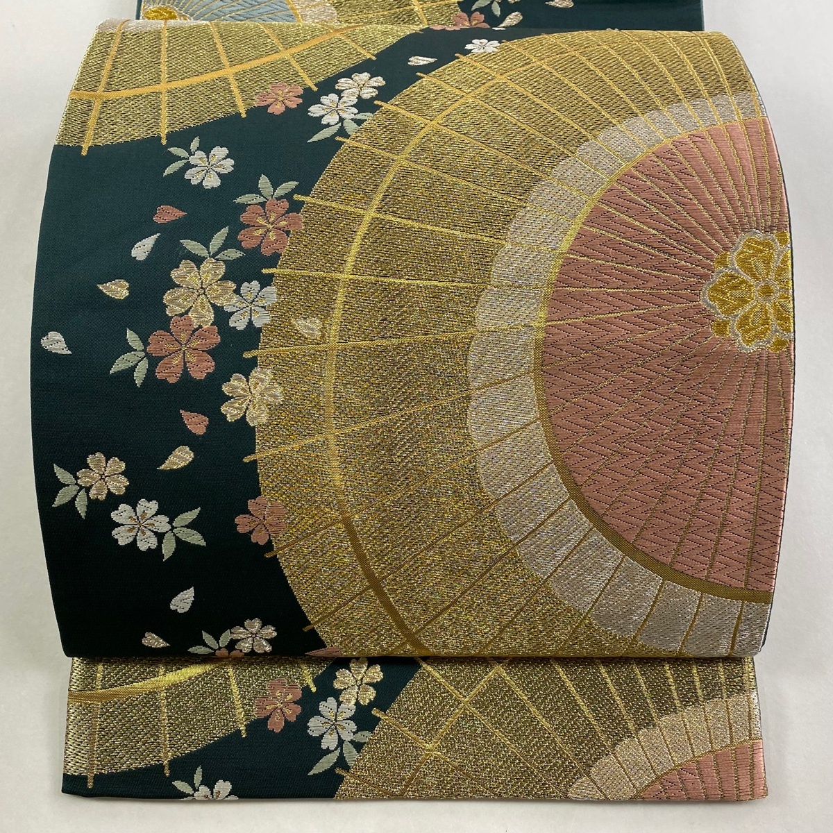 - 【美品】 袋帯 秀品 番傘 桜 金銀糸 箔 深緑 六通 正絹 【中古】