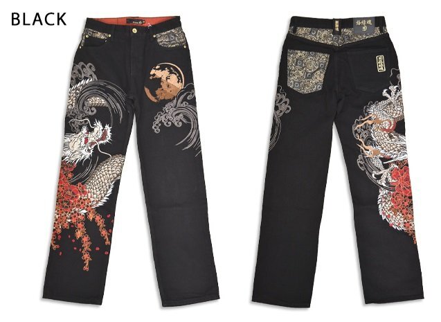- 粋 龍虎デニムパンツ◆絡繰魂 ブラック 36inch 36インチ 254247 和柄 和風 竜 トラ ジーンズ 刺繍 からくり