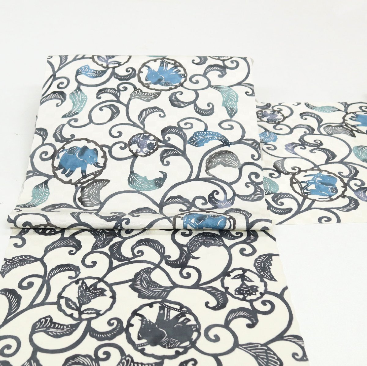 ※こちらの商品にはお仕立てはついておりません。 (お仕立て上がりの長さ目安:約3m70cm) 江戸紅型九寸名古屋帯(全通・お太鼓に彩色)をご紹介致します。 しなやかでややハリのある帯地はオフホワイト色のお色目でございます。生地には市松の地紋が施されており、やや光沢感がございます。 全体には墨黒色で象唐草が染められております。 お太鼓や胴部分には濃縹色、錆青磁色、灰藤色の彩色が施されております。 江戸紅型の素敵な染めの帯で、お洒落着の装いをお楽しみくださいませ。 -状態・素材:絹100% -落款・証紙: -参考着用年代:20代~幅広い年代でお召しいただけます。 -着用時期 :10月~5月 -合わせる着物: 小紋、紬、お召、お洒落着など
