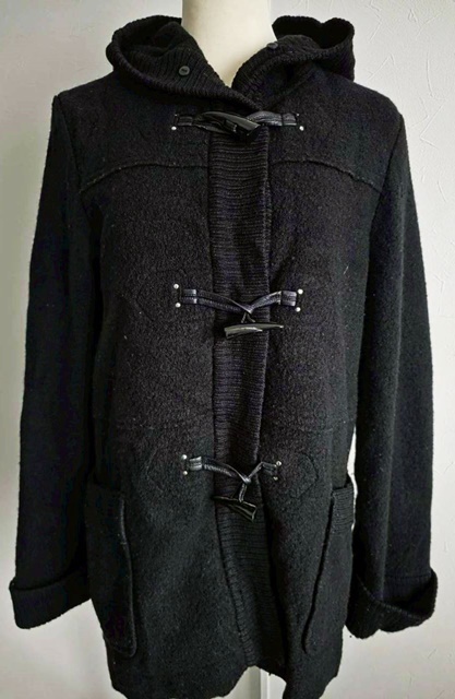 > Mサイズ位 ESPIE 長袖 ダッフルコート トグルボタン 袖リブニット フード 黒 38サイズ 毛100%
