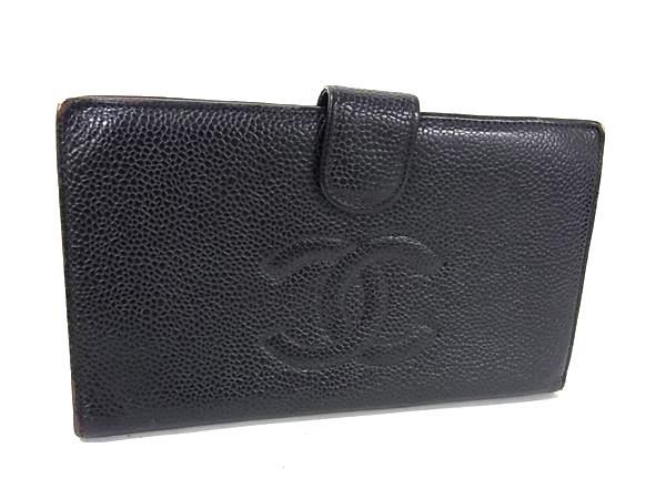 > 1円 CHANEL シャネル ココマーク キャビアスキン がま口 二つ折り 長財布 ウォレット 小銭入れ 札入れ レディース ブラック系 FQ2939