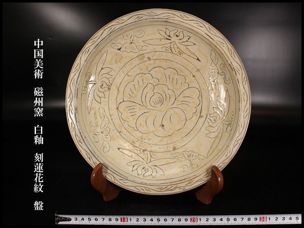 > 【金閣】中国美術 磁州窯 白釉 刻蓮花紋 盤 φ29cm 旧家蔵出 送料無料(N852)