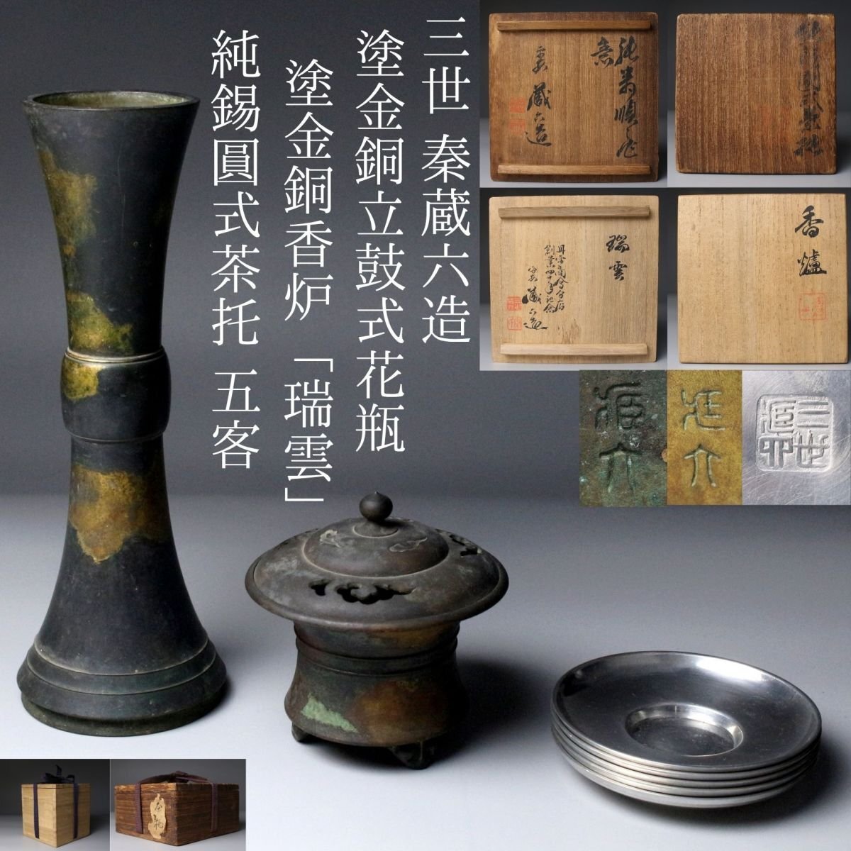 > 【LIG】三世 秦蔵六造 塗金銅立鼓式花瓶 塗金銅香炉「瑞雲」張萬順之作意 純錫圓式茶托 五客 共箱 共布 コレクター収蔵品[.RP]25.10