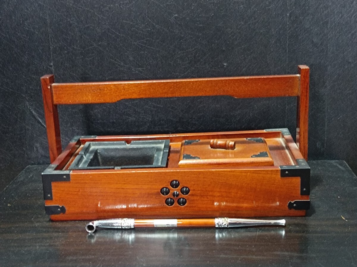 - レトロ 木製手提げ灰皿(小物入れ)昭和時代のレトロなアンティーク品 木製手提げタイプ(岡持型)キセル付
