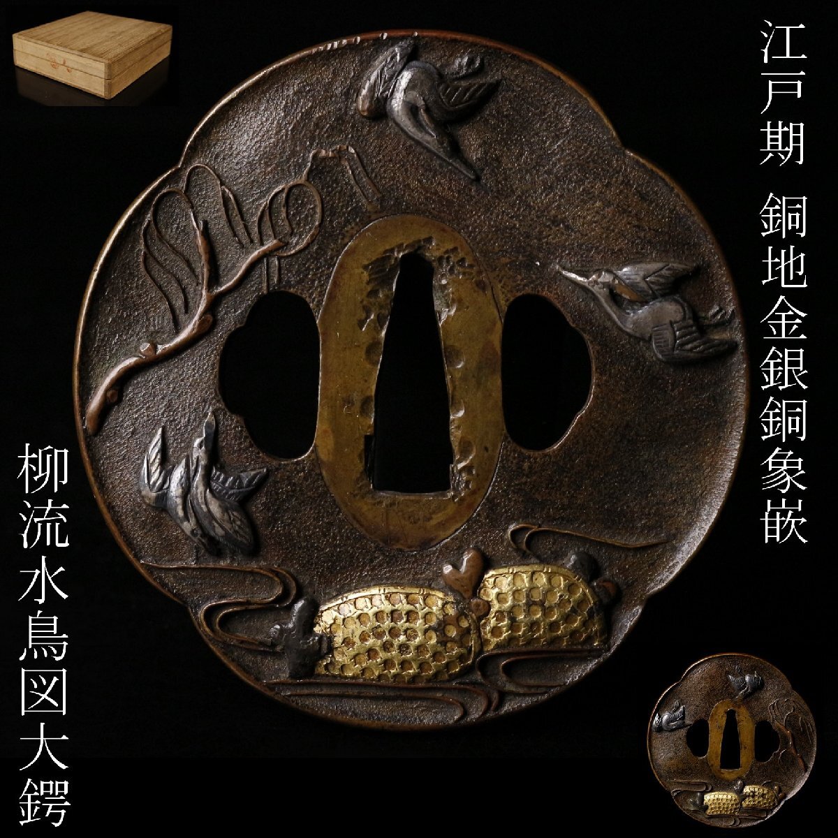 > 【LIG】江戸期 銅地 金銀銅象嵌 柳流水鳥図大鍔 8.2㎝ 刀装具 時代武具 コレクター収蔵品 [.QR]25.10