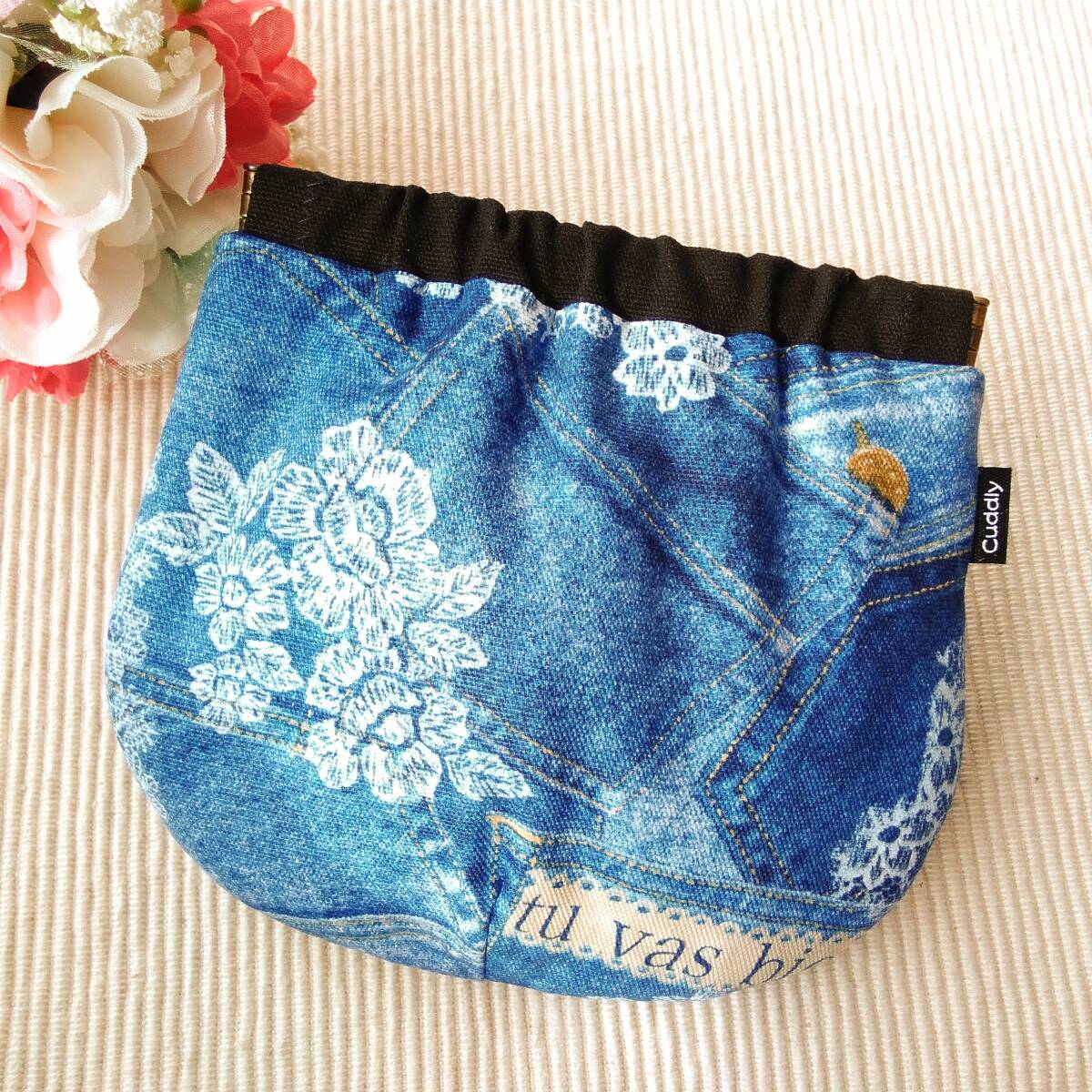 - ハンドメイド バネポーチ デニムポケット柄 ブルー
