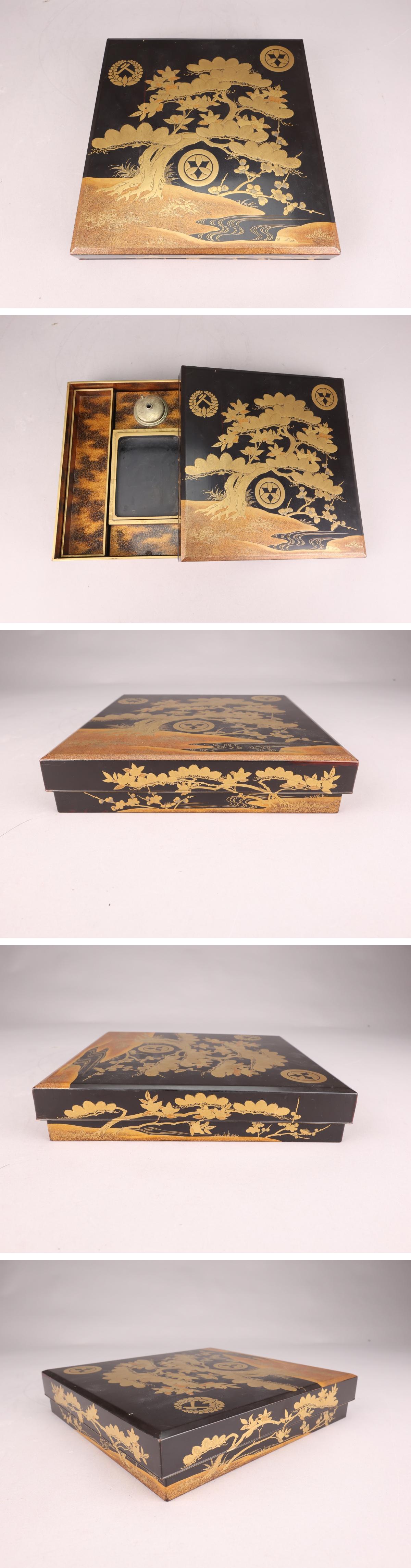 【志】A1378 蒔絵硯箱 松文 家紋 金梨地 書道具 時代物