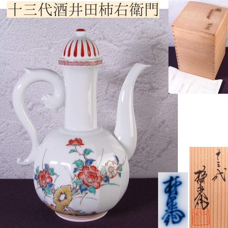 > 十三代酒井田柿右衛門造 錦 岩牡丹文水差 水注 面取 高さ:22.5cm 美品 共箱・栞付/25k044