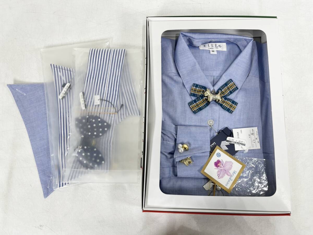 - 未使用 1円~ ELLE ブラウス ブルー サイズ38 ブローチ付 百貨店箱あり レディース シャツ 洋服 綿100%