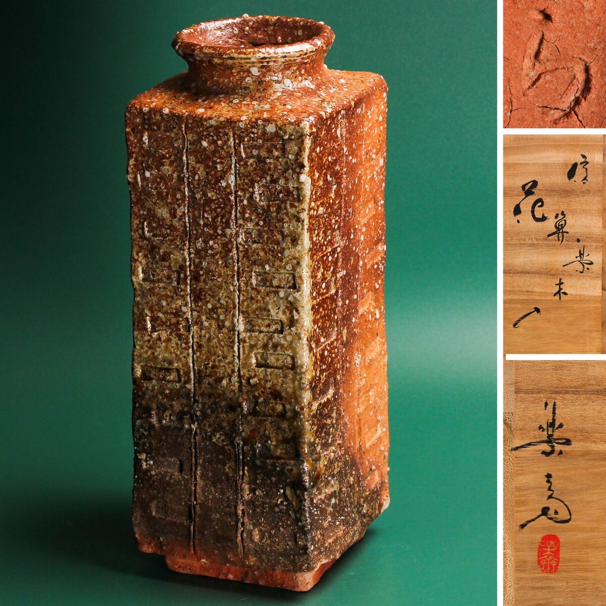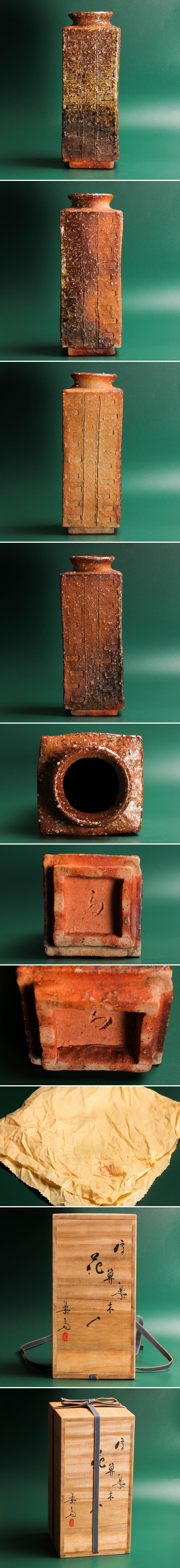 - 四代 高橋楽斎 信楽算木花入 高さ27.7cm 共箱 共布 本物保証