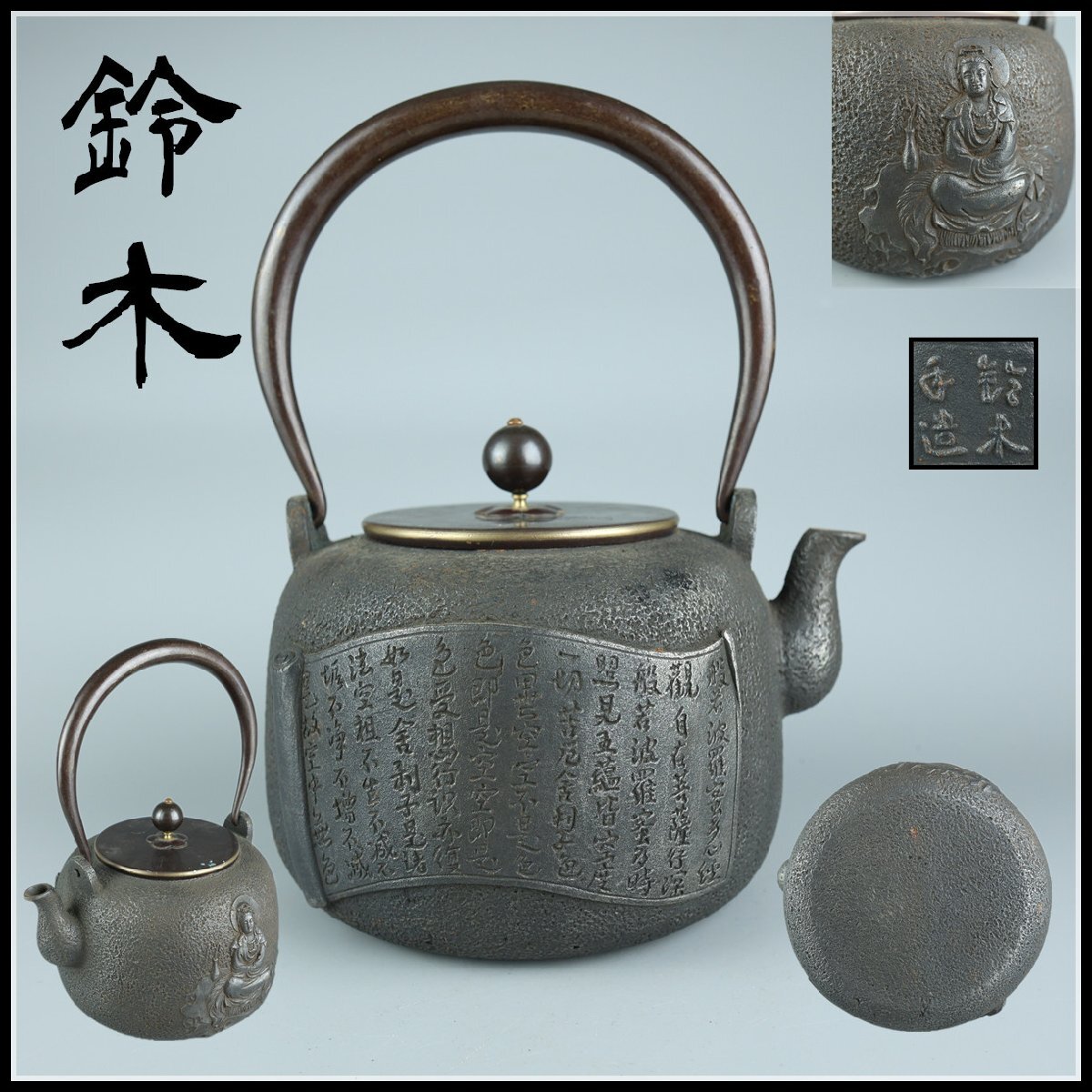 【志】K1510 鉄瓶 鈴木手造 観音像 心経刻 茶道具 湯沸 重量2075g 容量1200ml