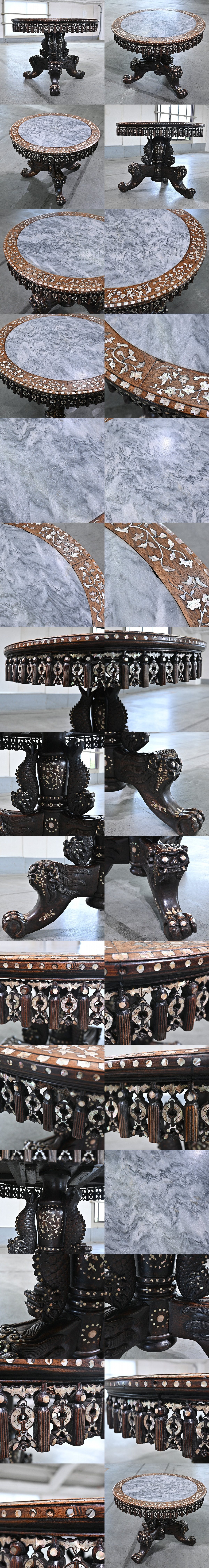 > アジアンビンテージ 螺鈿テーブル パドック材 大理石 貝殻 獣脚 彫刻 獅子 ラウンド 丸 円卓 机 作業台 ディスプレイ 飾り棚 装飾 花