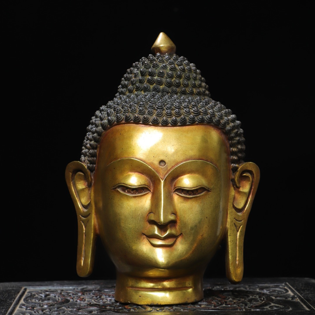 - 旧蔵 古銅彫 塗金 釋迦牟尼 佛首 古擺件 古置物 中国古玩 骨董品 時代物 稀少唐物
