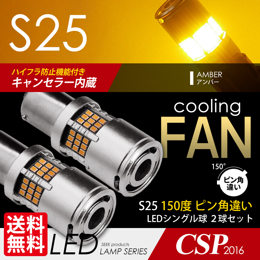 > S25 LED SEEK 54連 冷却ファン付 ウインカー 150度 黄 アンバー ピン角違い ハイフラ防止キャンセラー内蔵 国内点灯確認 ネコポス 送料無料