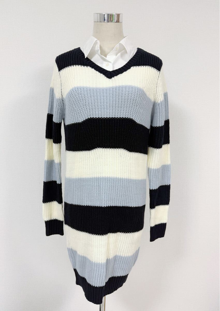 > INGNI 新品タグ付未使用品 ホワイト ニット ワンピース ボーダー柄 長袖 ネイビー 冬春 紺 水色 ブルー 白 ガーリー イング 編みレディース