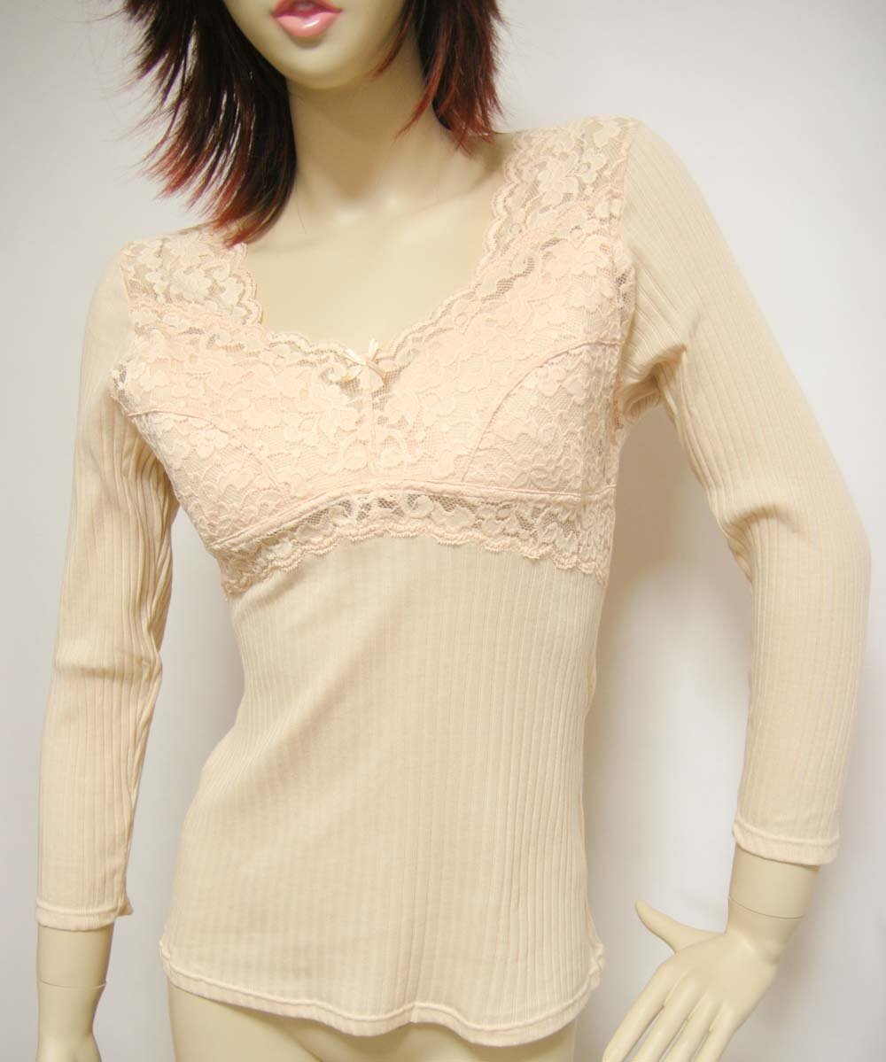 > 送料無料◆綿100%◆さらっと快適◆爽やかな肌触り◆伸縮性抜群◆針抜き編み◆ソフトブラカップ付き◆らくらく8分袖インナー(L/ベージュ)