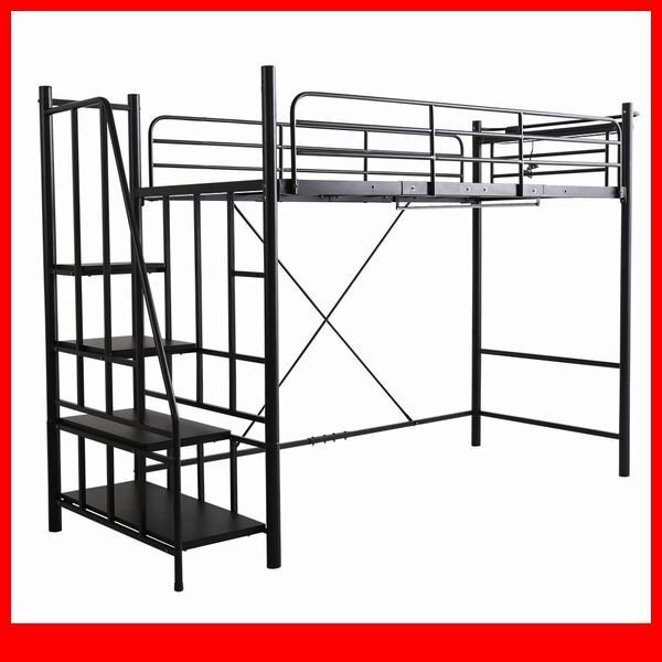 > ロフトベッド★ヴィンテージ風 高さ調整可能 階段付きロフトベッド シングル/宮棚 コンセント ハンガーパイプ/ハイ ミドル/ブラック/a1