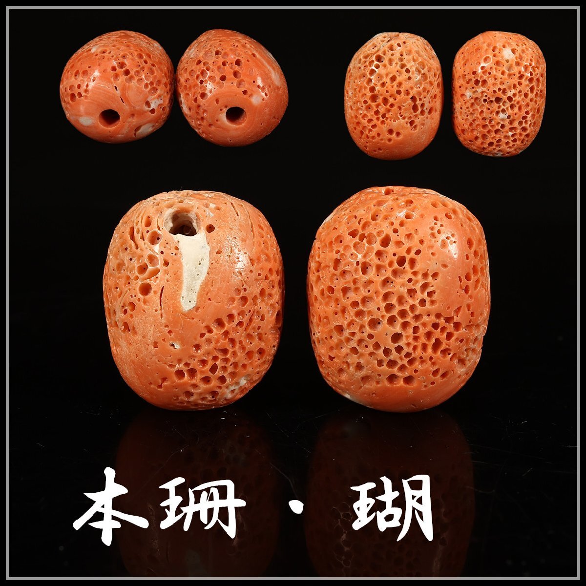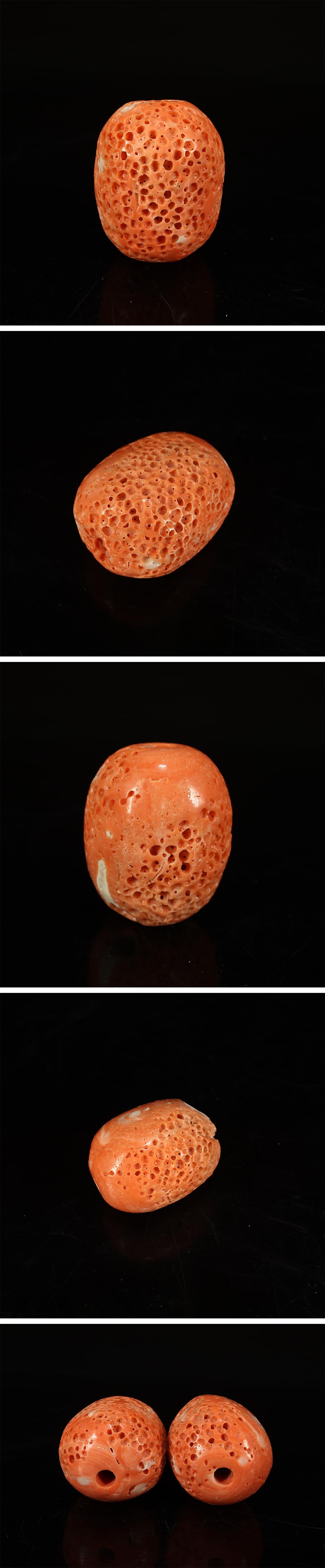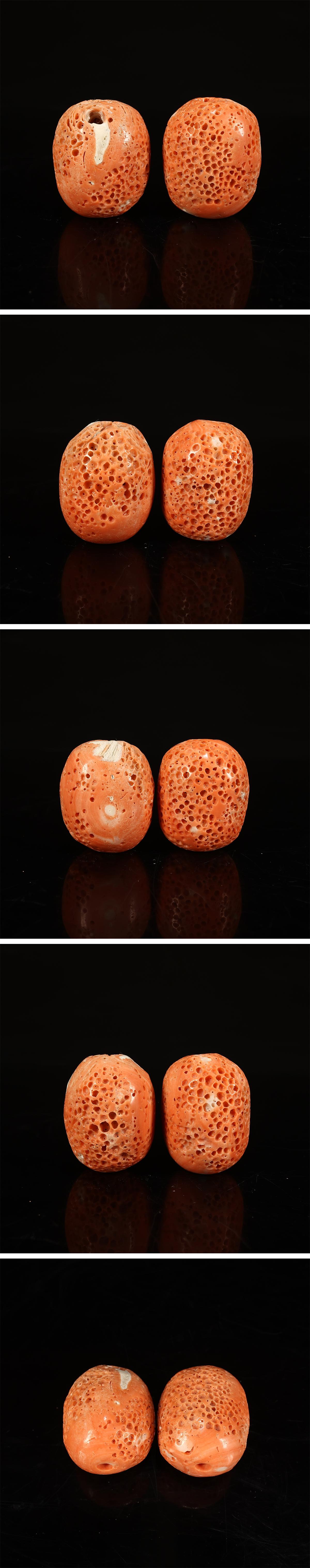 【吉】ZD011 時代 東洋彫刻 【本珊・瑚】 赤珊・瑚玉 緒締玉 2点 一対 幅3.3×2.8㎝/本物保証品!拍卖