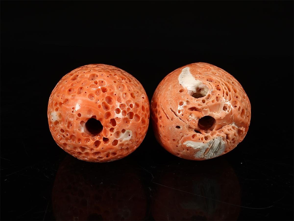 【吉】ZD011 時代 東洋彫刻 【本珊・瑚】 赤珊・瑚玉 緒締玉 2点 一対 幅3.3×2.8㎝/本物保証品!