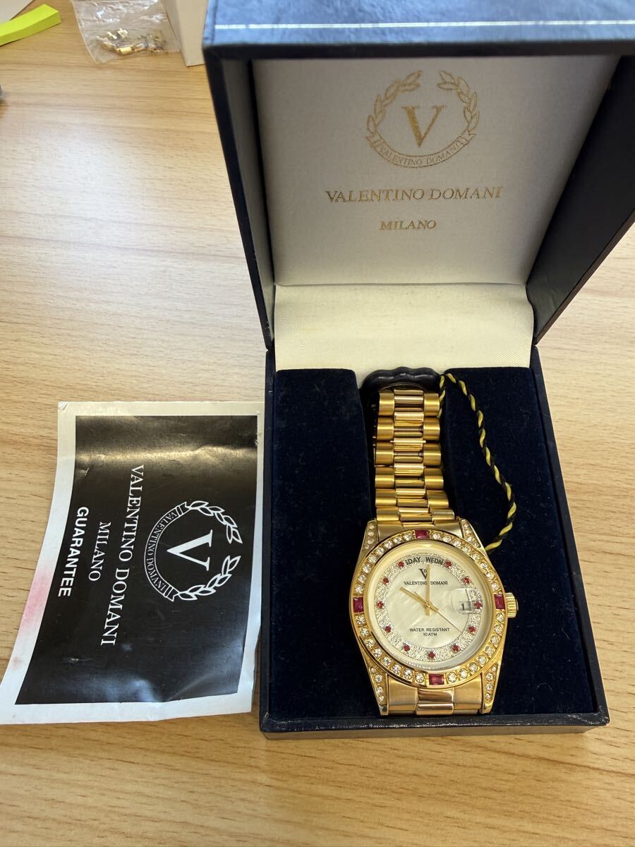 > 電池切れ 美品 VALENTINO DOMANI バレンチノ VD-2007 シェル文字盤 石付き デイデイト メンズ腕時計 ゴールド金 お洒落 クォーツ