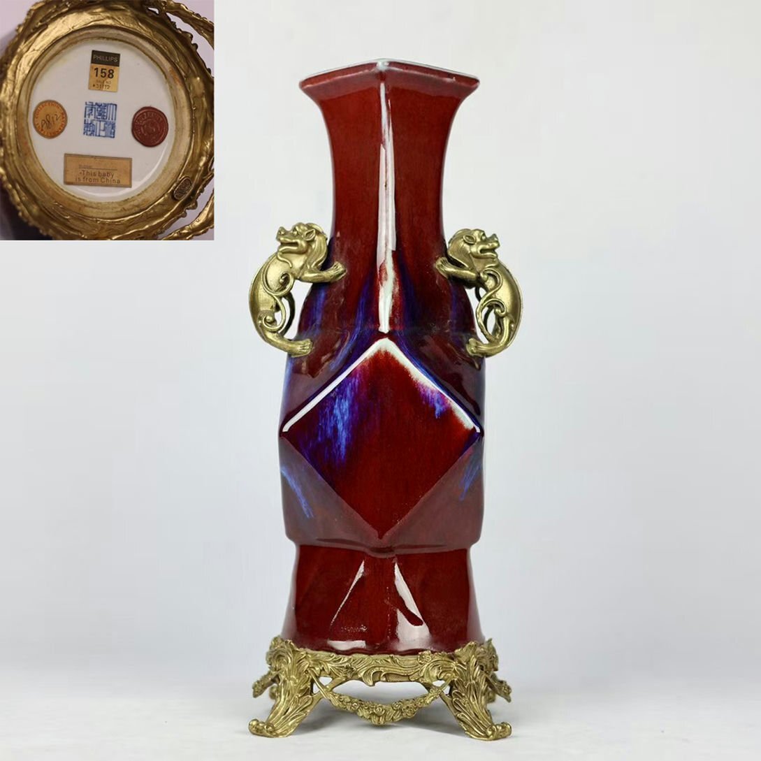 - ▼渡鶴羽▼A0747清時代 窯変釉象嵌銅貔貅双耳鑽石瓶・古陶磁器 ・珍品旧蔵・古賞物・時代物