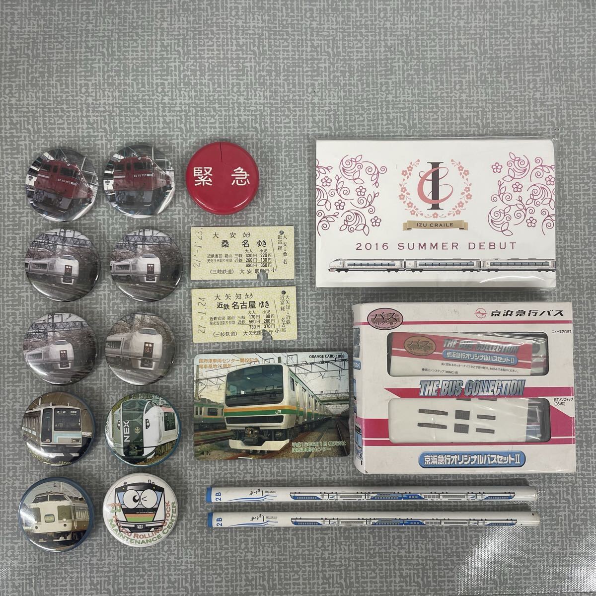 - 鉄道グッズまとめ 京浜急行オリジナルバスセットⅡ 箱付/近鉄 しまかぜ 鉛筆/JR東日本 オレンジカード/切符/缶バッジ/非常ボタン 他