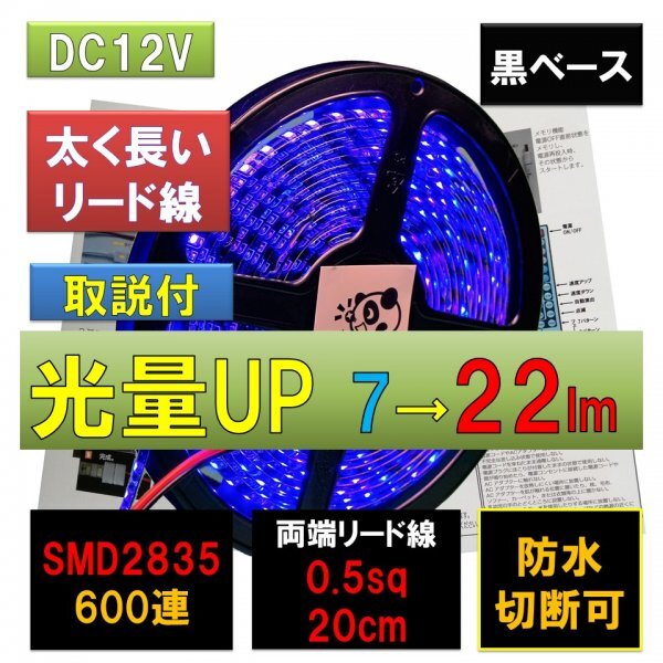 - 高輝度ピカット LEDテープライト 12V 防水 5m 青 ブルー 黒ベース SMD2835 22lm 600連 太くて長い両端配線 0.5sq 20cm fa