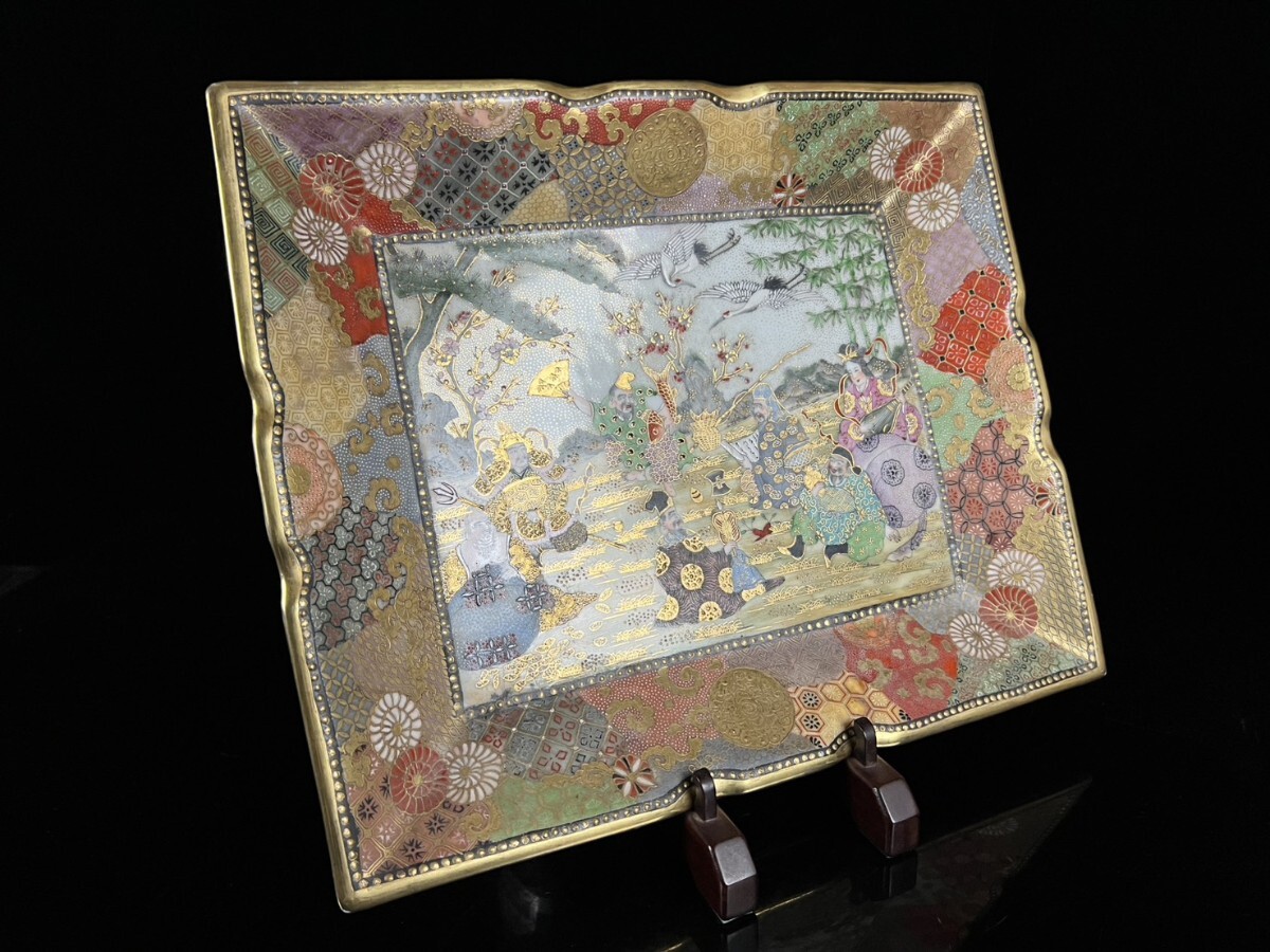 > 明治大正期 薩摩焼 金襴手 七福神図色絵長方皿 39cm 細密絵付 金彩 豪華絢爛 時代物 唐物骨董[麌]