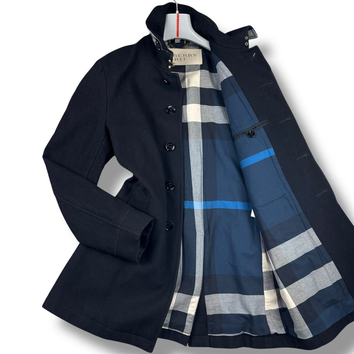 - 1円 美品 L~XL.LL バーバリーブリット BURBERRY BRIT ウールステンカラーコート ノバチェック メガチェック メルトン メンズ ネイビー M