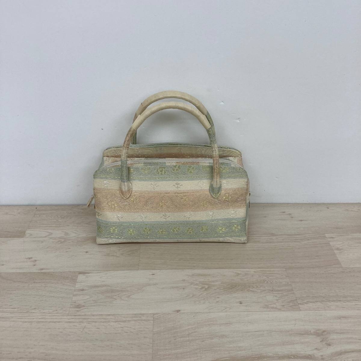 > 和装用バッグ/和装小物 ハンドバッグ ゴールド/淡緑/ピンク ボーダー柄 金糸 織物 着物/浴衣 レディース[OA02939]