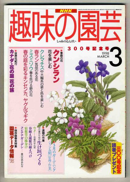 書名/記事: 98.3 趣味の園芸/クンシラン、クレマチス、春ラン、ミスミソウ、キンセンカ、ヤグルマギク、生け垣づくり、ウメ-花後のせん定、春植え球根の植えつけ、宿根草の株分け、...