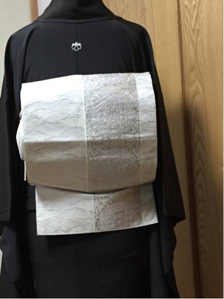 - 【袋帯】正絹 六通 長さ129cm 銀糸 宝相華 光琳波