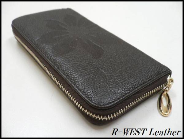 - 牛革 花柄 型押しレザーウォレット/こげ茶/ファスナータイプ革財布