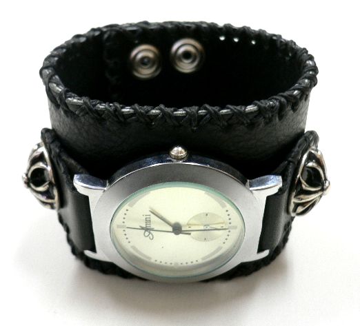 - 牛革レザー ブレス ウォッチ黒 クロスコンチョ付/ハンドメイド革ブレスALL20%OFF